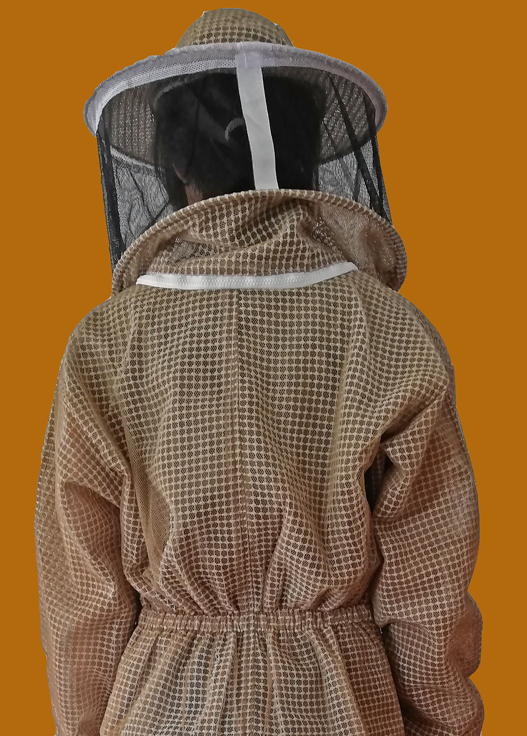 Pessoa de costas com fato de apicultor bege e rede preta de proteção