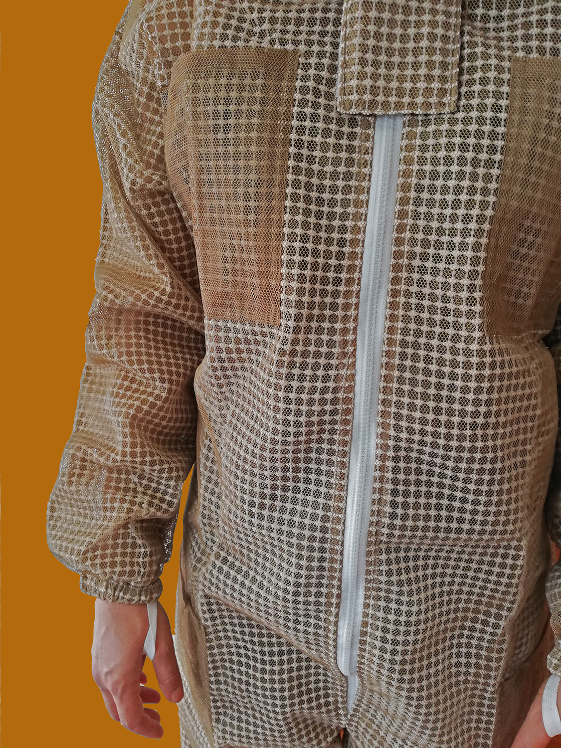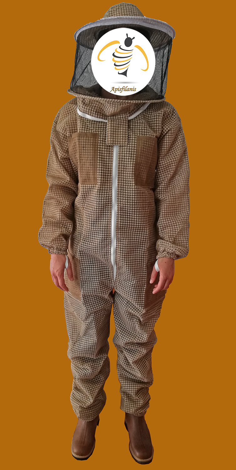 Macacão de apicultura bege com padrão quadriculado e rede protetora preta no rosto com logótipo Apisflanis