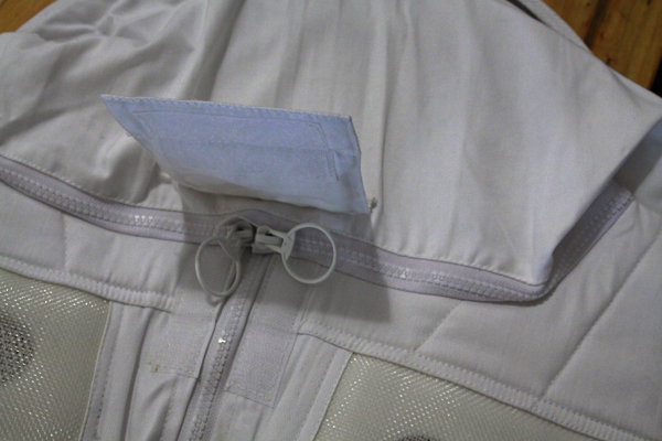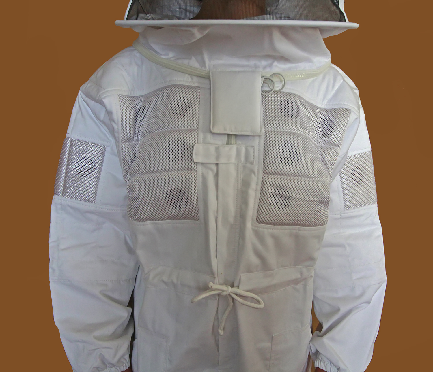 Casaco branco de apicultor com painéis de malha para ventilação e capuz com rede protetora