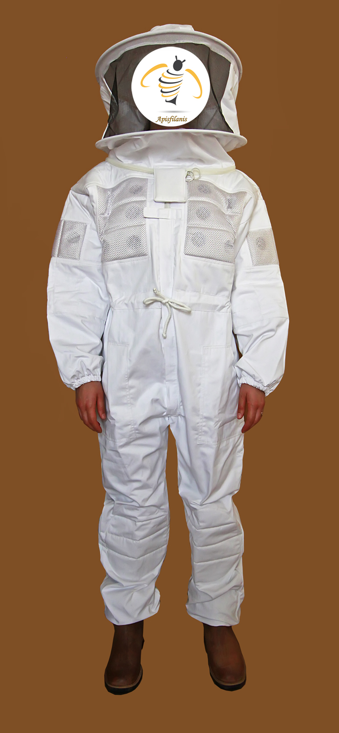 Macacão branco de proteção para apicultura com rede na parte superior e logotipo Apisflanis