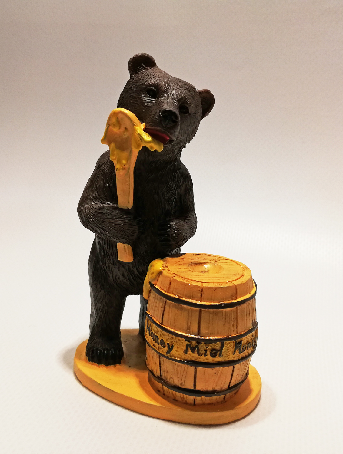 Figurine de urso castanho com colher de mel e barril de mel de madeira