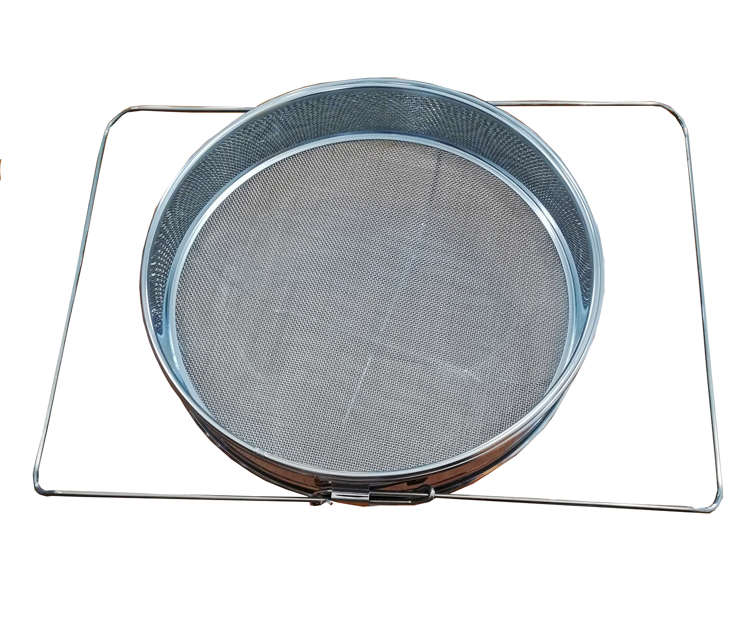 Peneira redonda metálica com malha fina e suporte retangular