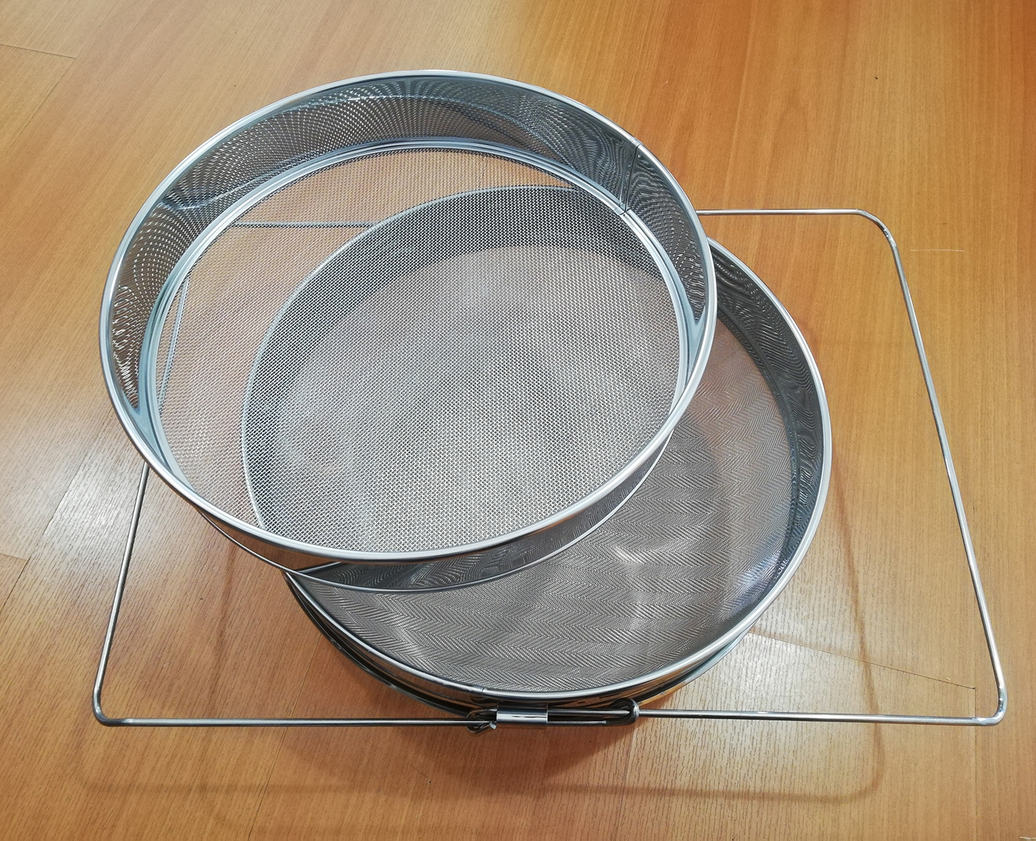 Set de três peneiras de metal com malha fina sobre chão de madeira.
