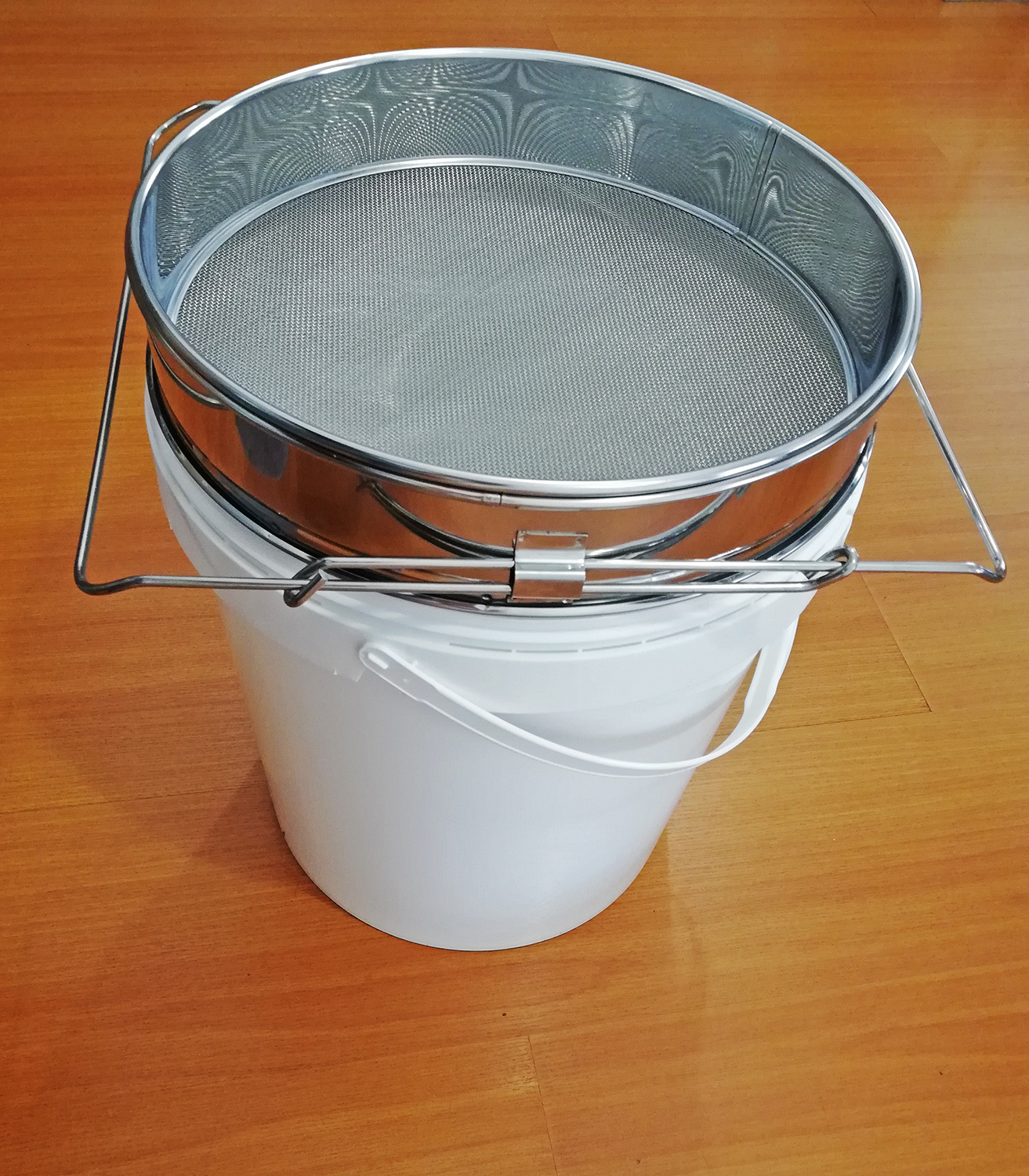 balde branco de plástico com peneira metálica redonda prateada em cima