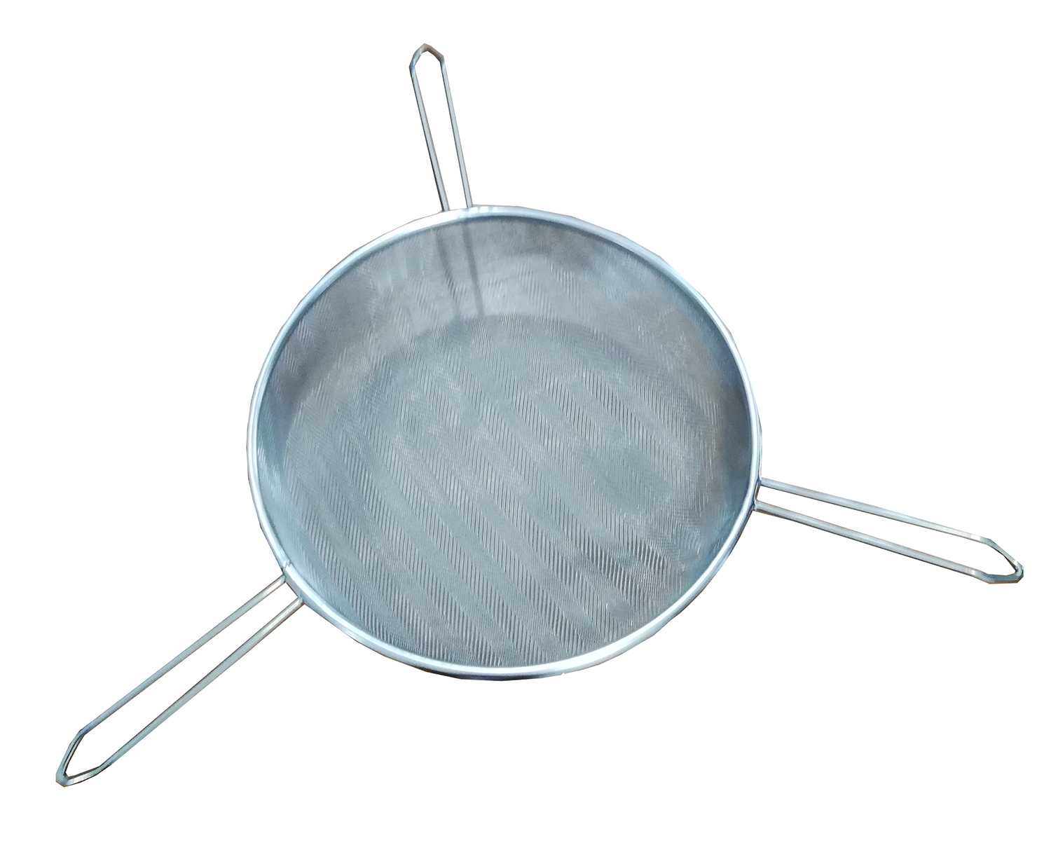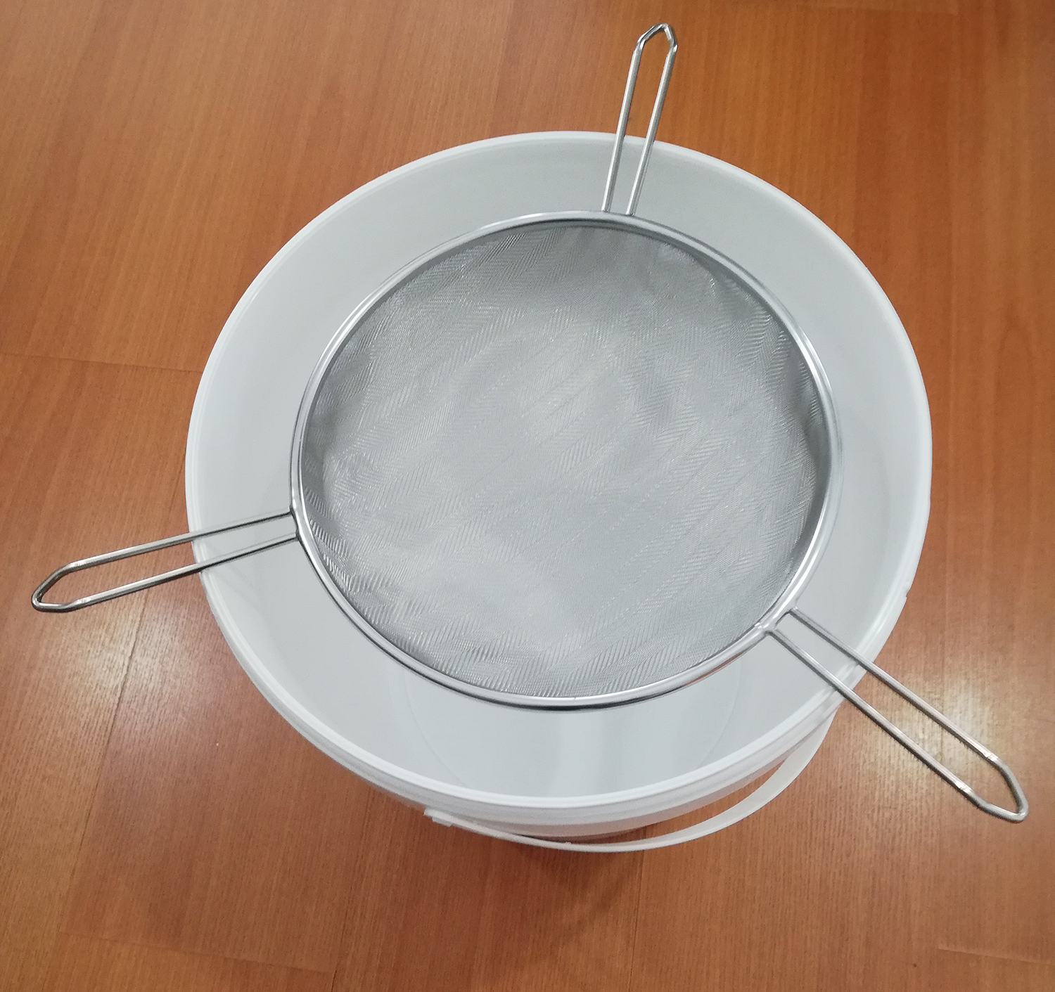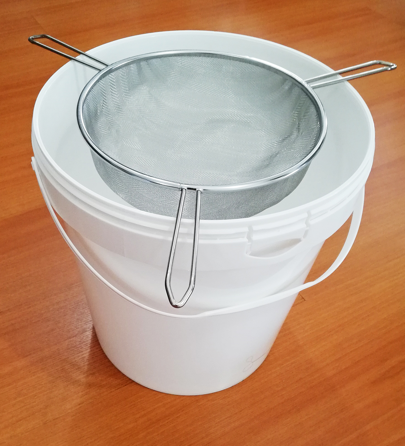 balde branco de plástico com coador metálico por cima numa mesa de madeira