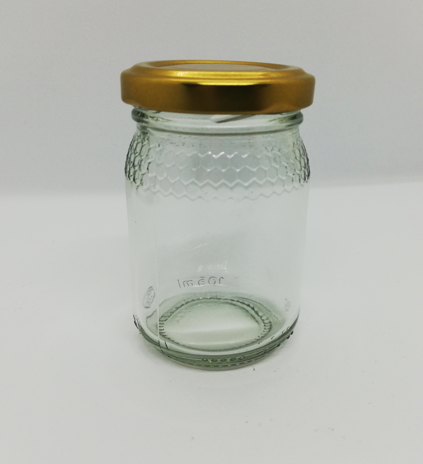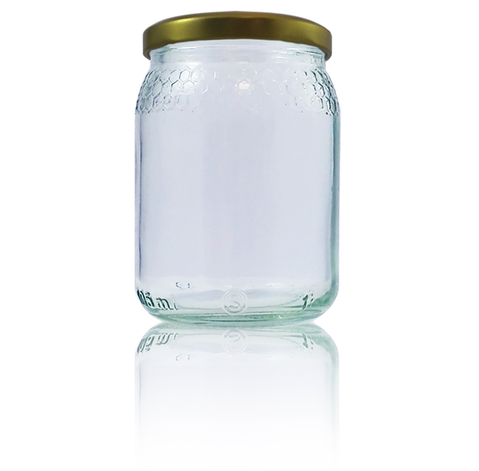 Frasco de vidro transparente com tampa metálica dourada sobre fundo branco