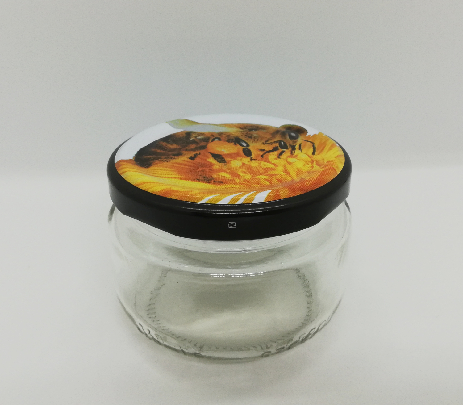 Frasco de vidro com tampa decorada com abelha sobre flor amarela