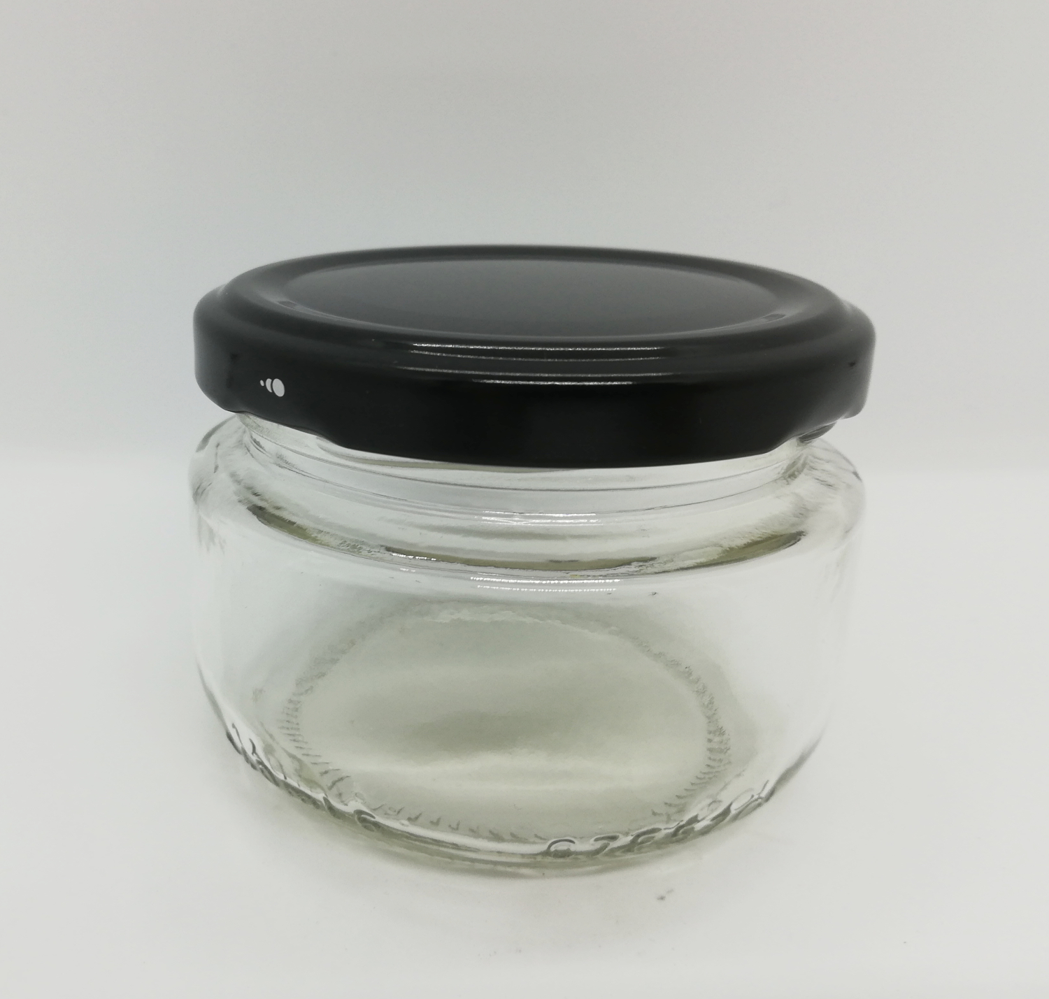 Frasco de vidro transparente com tampa preta