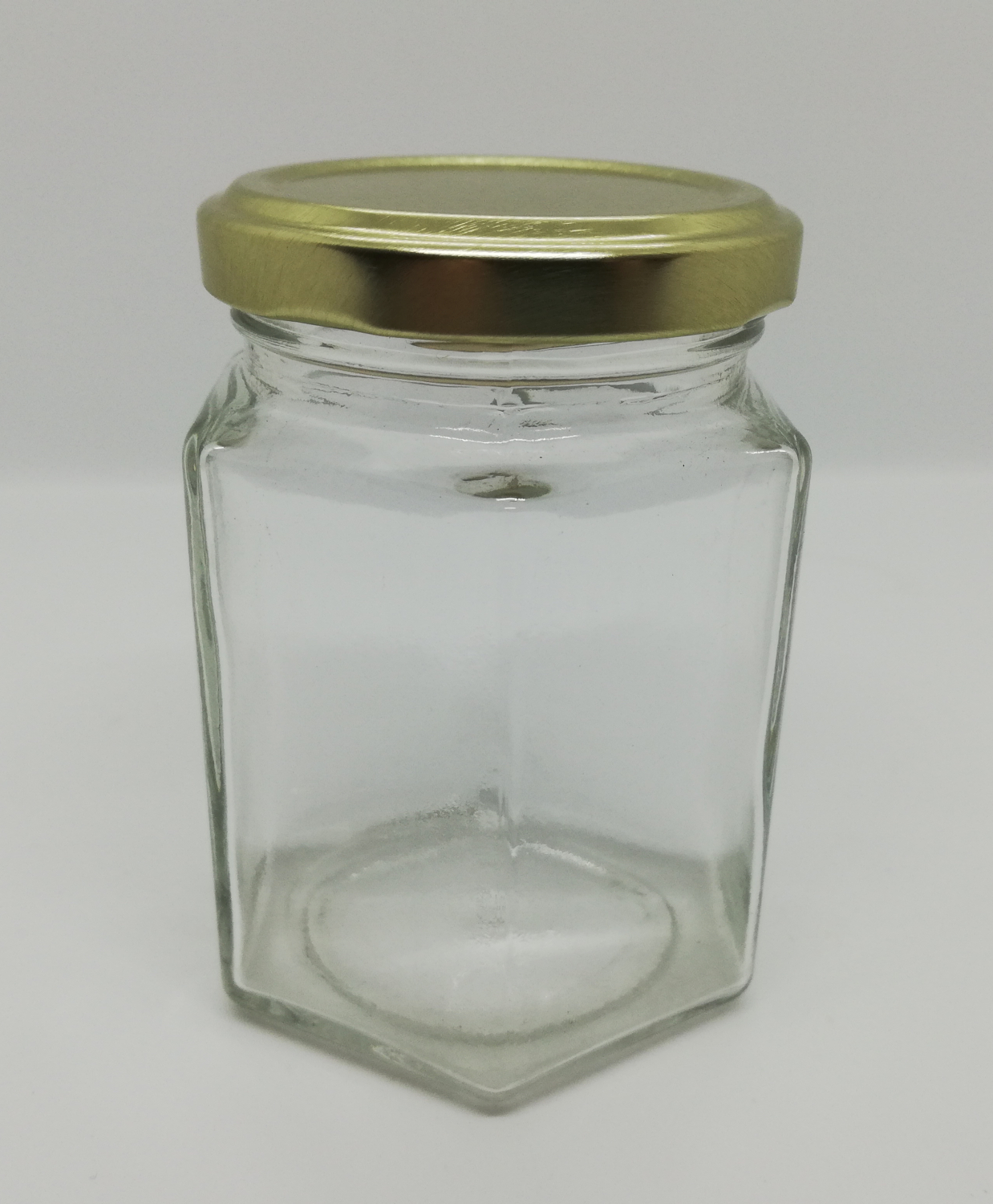 Frasco hexagonal de vidro transparente com tampa dourada