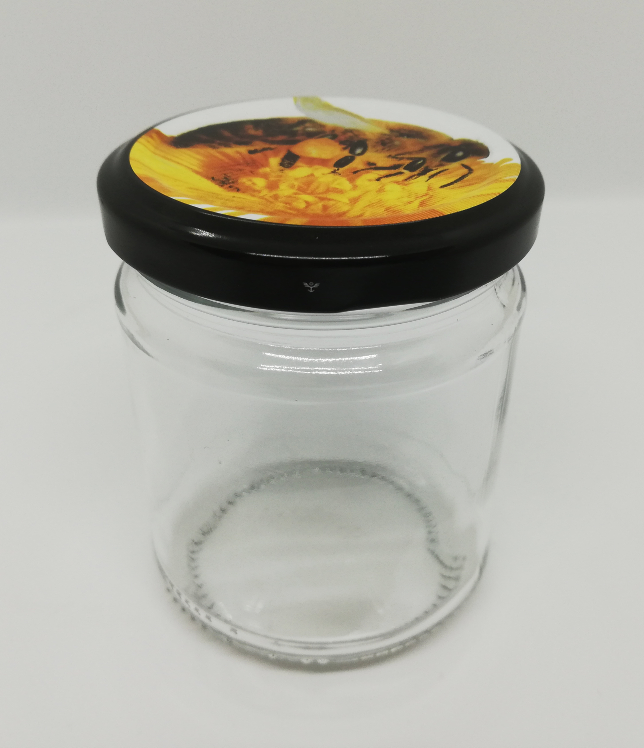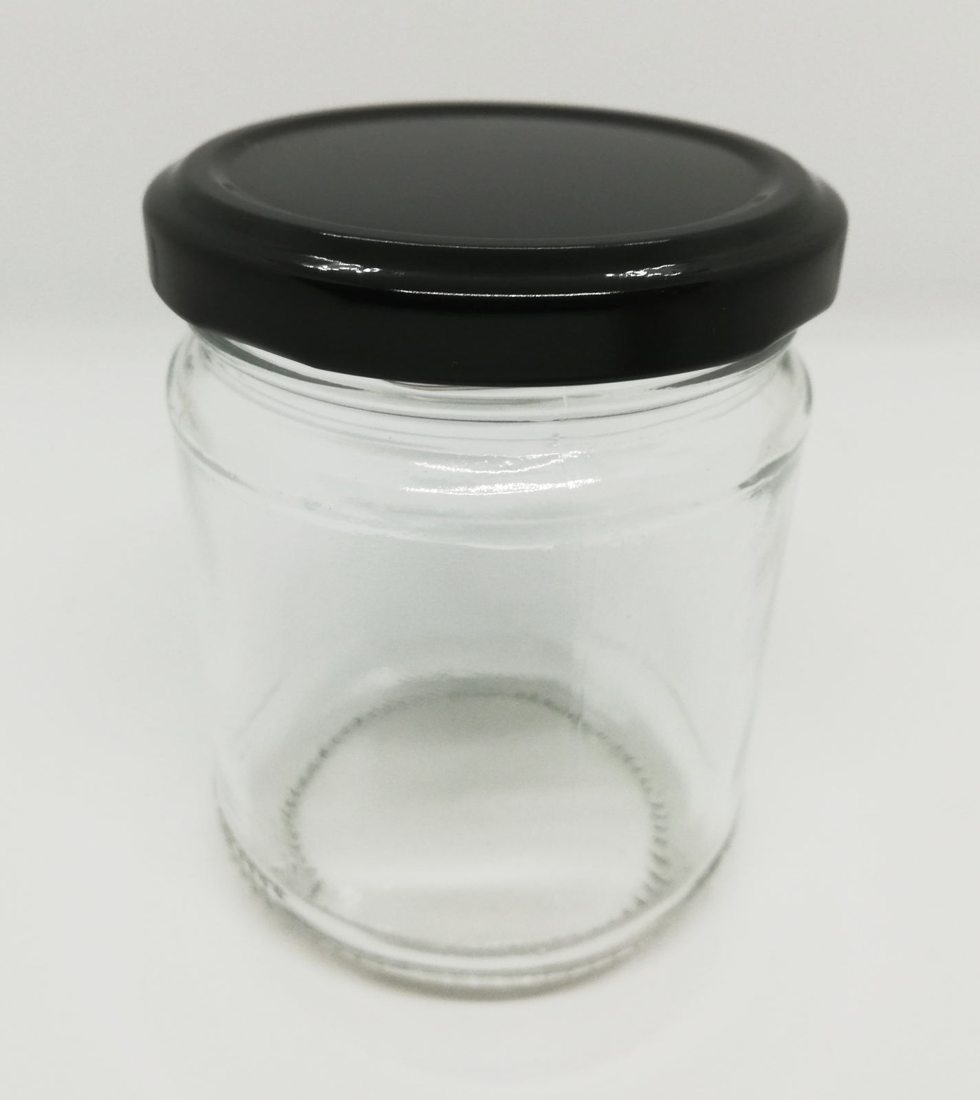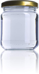 Frasco de vidro transparente com tampa dourada sobre fundo branco