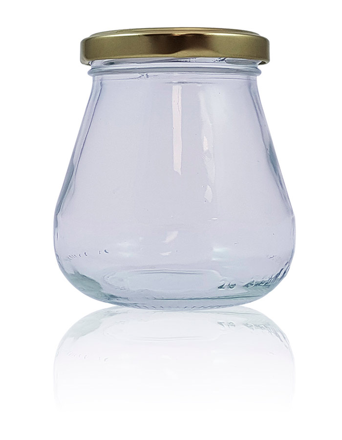 Frasco de vidro transparente com tampa metálica dourada