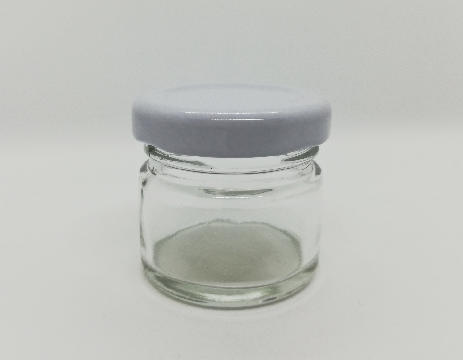 Frasco pequeno de vidro transparente com tampa cinza