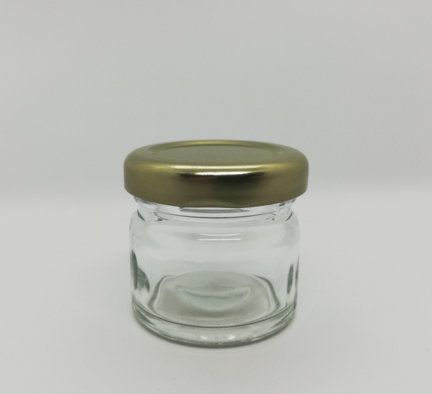 Frasco pequeno de vidro com tampa metálica dourada