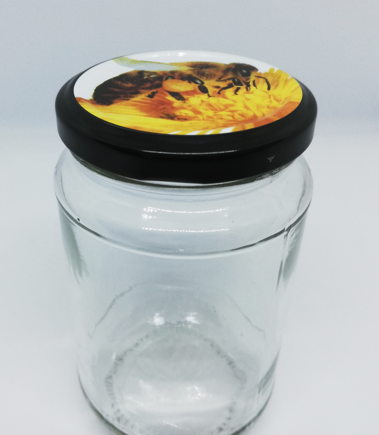 Frasco de vidro com tampa preta e imagem de abelha numa flor amarela.
