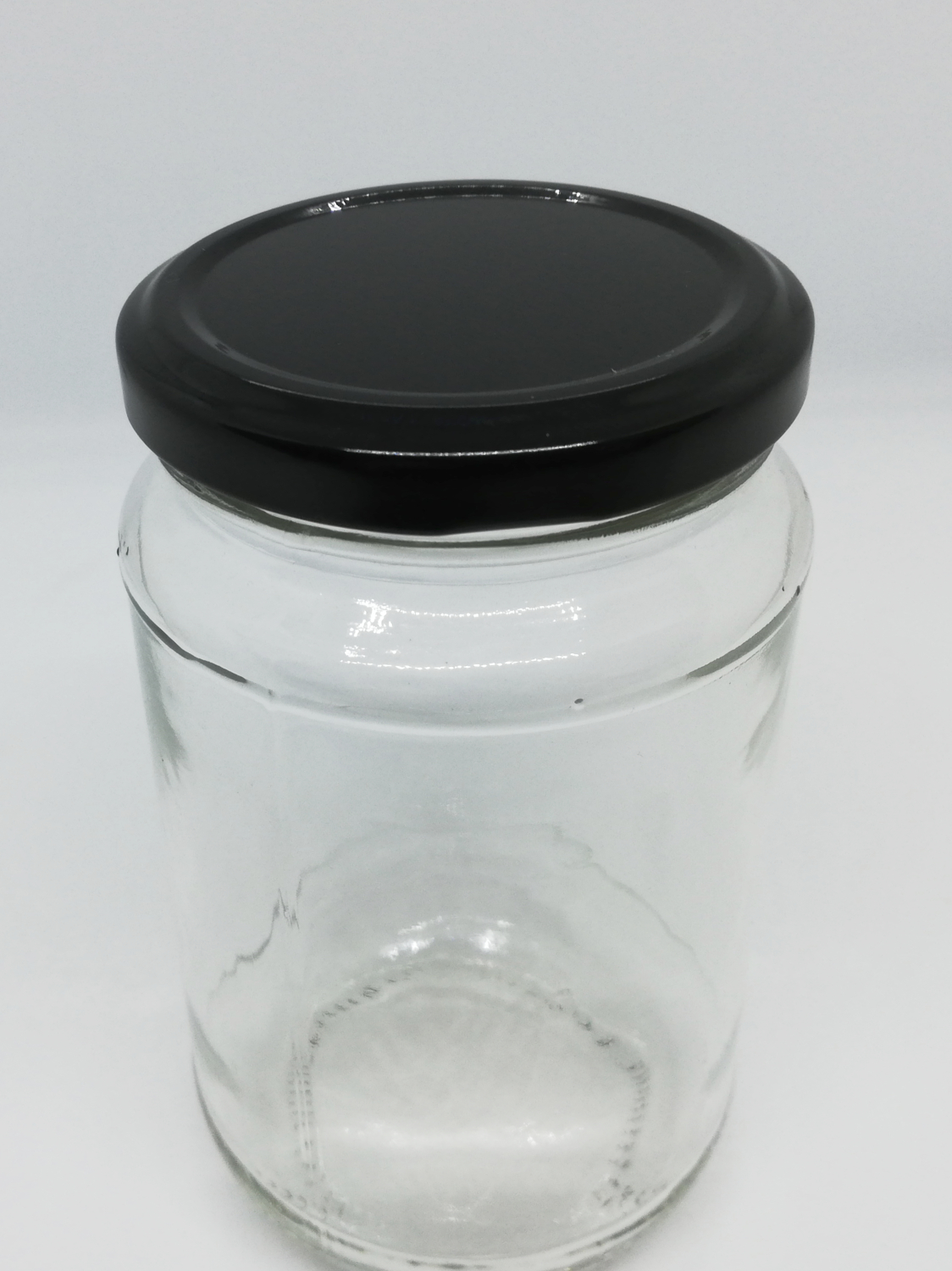 Frasco de vidro transparente com tampa preta