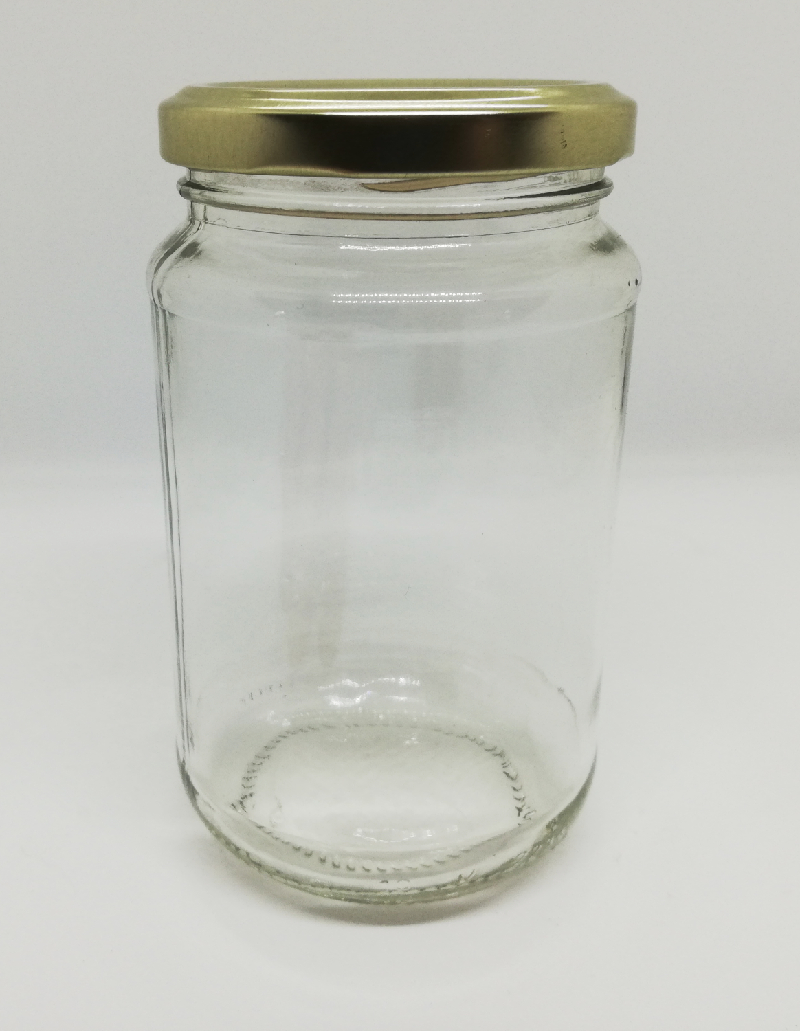 Frasco de vidro transparente com tampa dourada