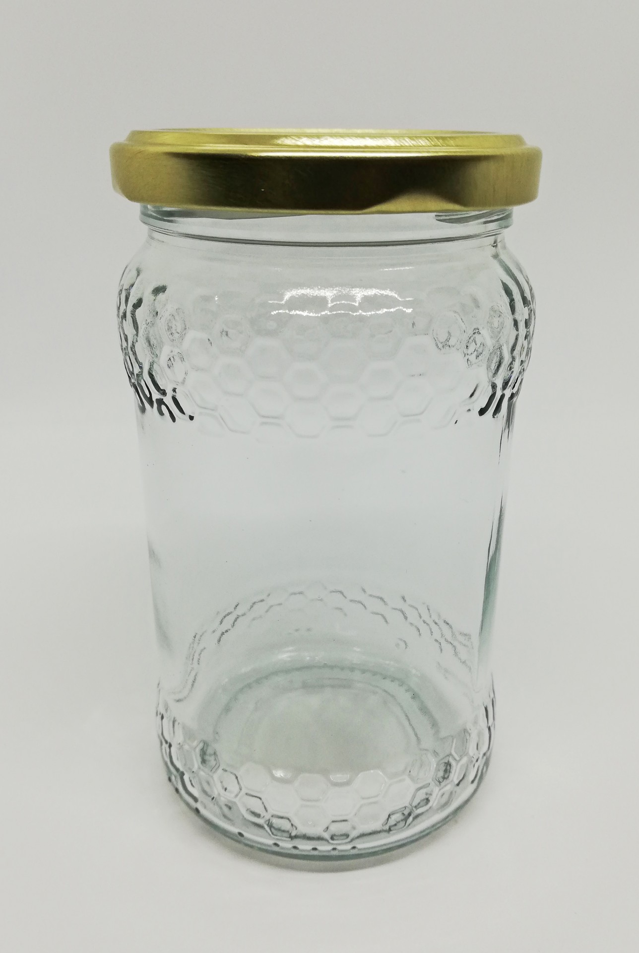 Frasco de vidro com padrão de favos de mel e tampa dourada