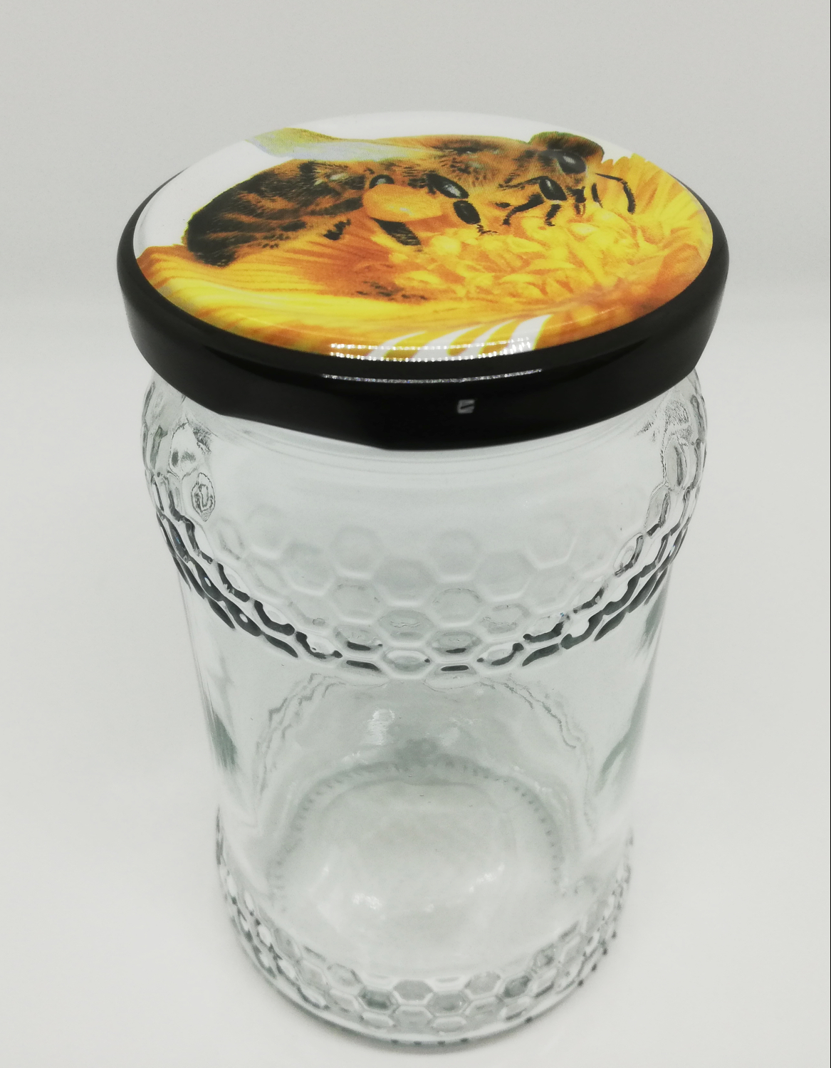 Frasco de vidro com tampa decorada com imagem de abelha
