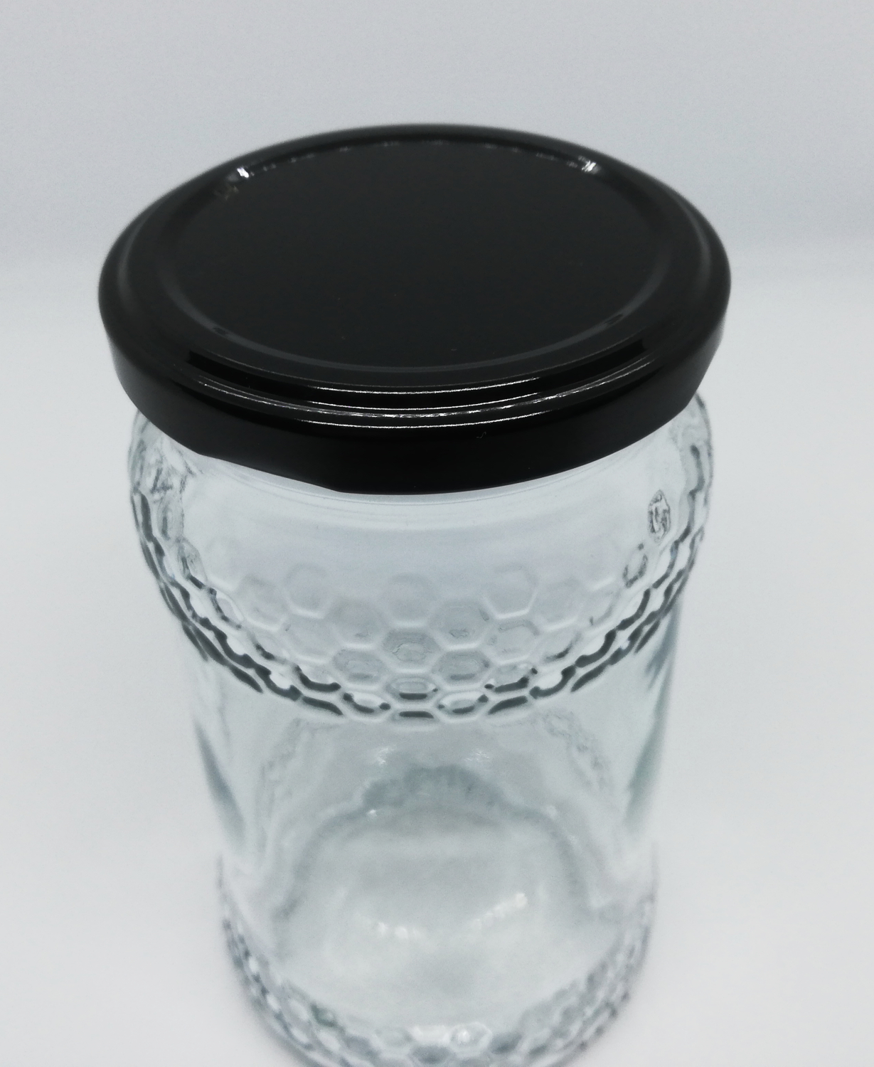 frasco de vidro com tampa preta e textura hexagonal