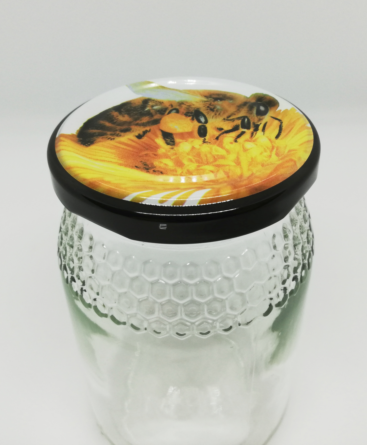 Frasco de vidro com tampa decorada com abelhas e flor amarela