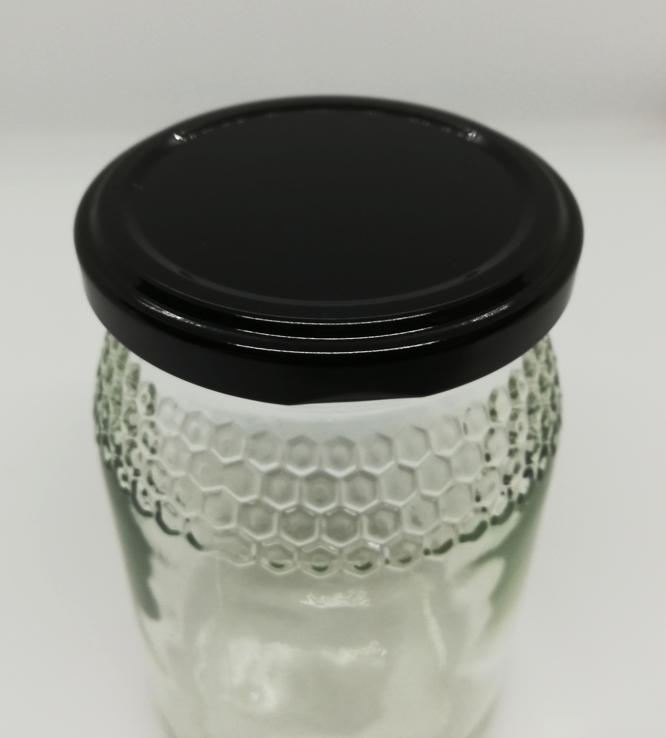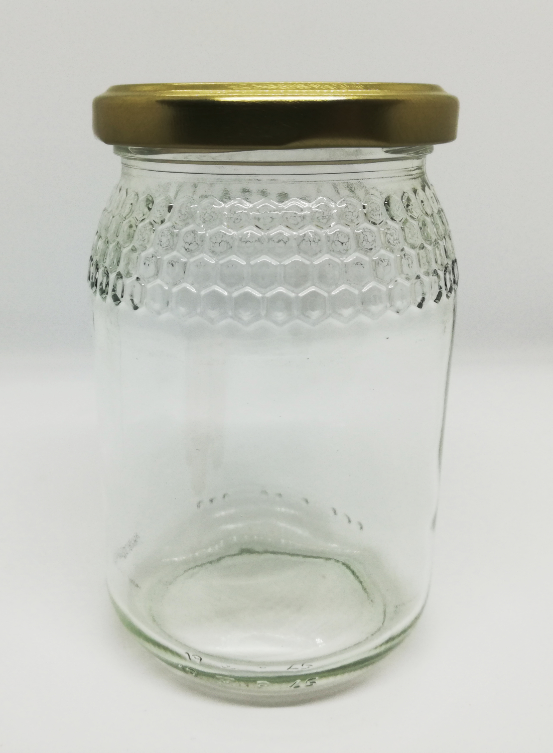 Frasco de vidro transparente com tampa metálica dourada e textura de colmeia