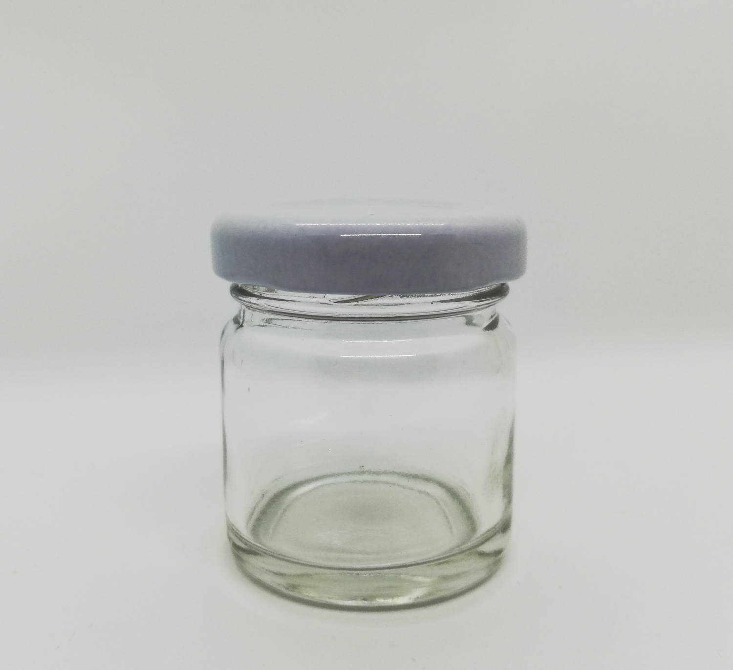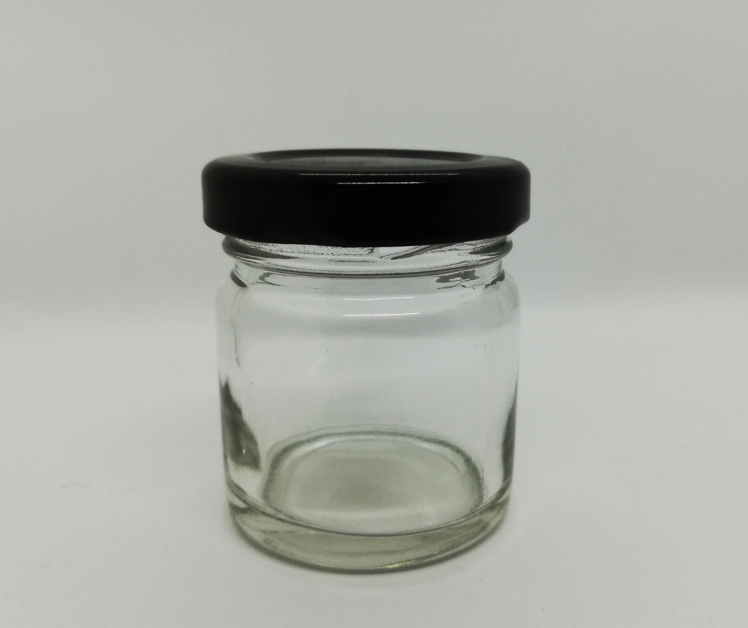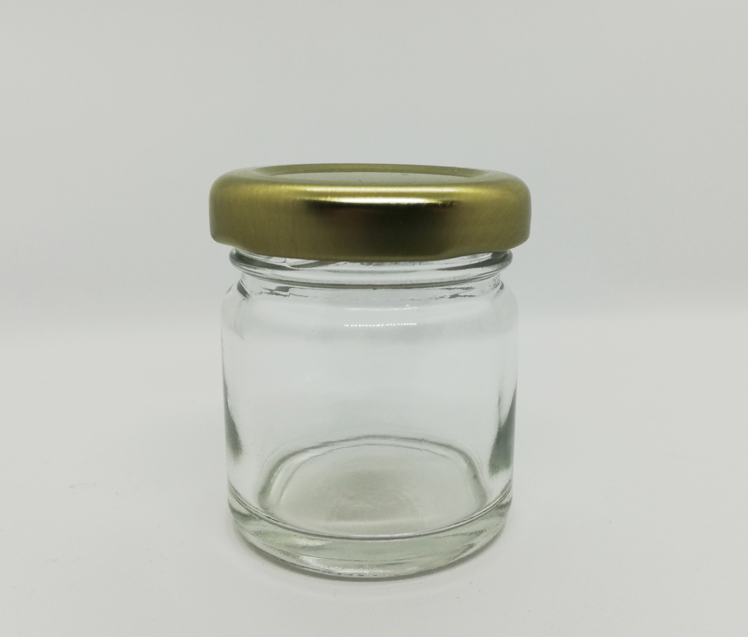 Frasco pequeno de vidro com tampa dourada sobre fundo branco