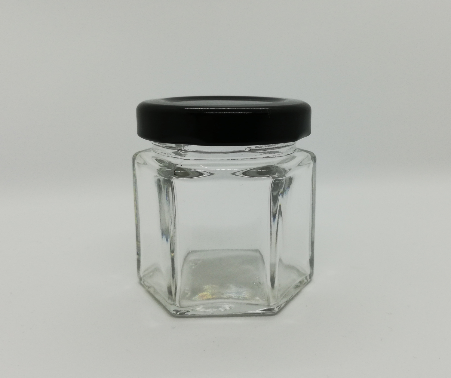 Frasco de vidro hexagonal com tampa preta sobre fundo branco