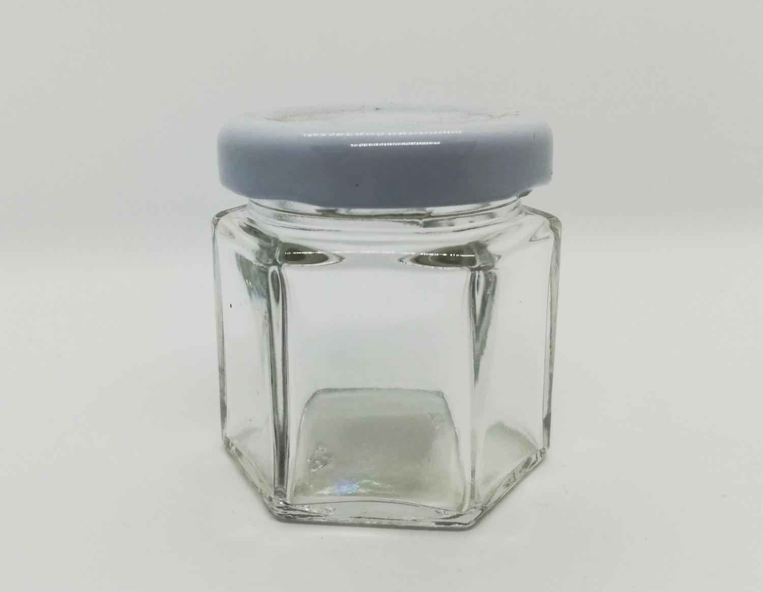 Frasco de vidro hexagonal com tampa branca
