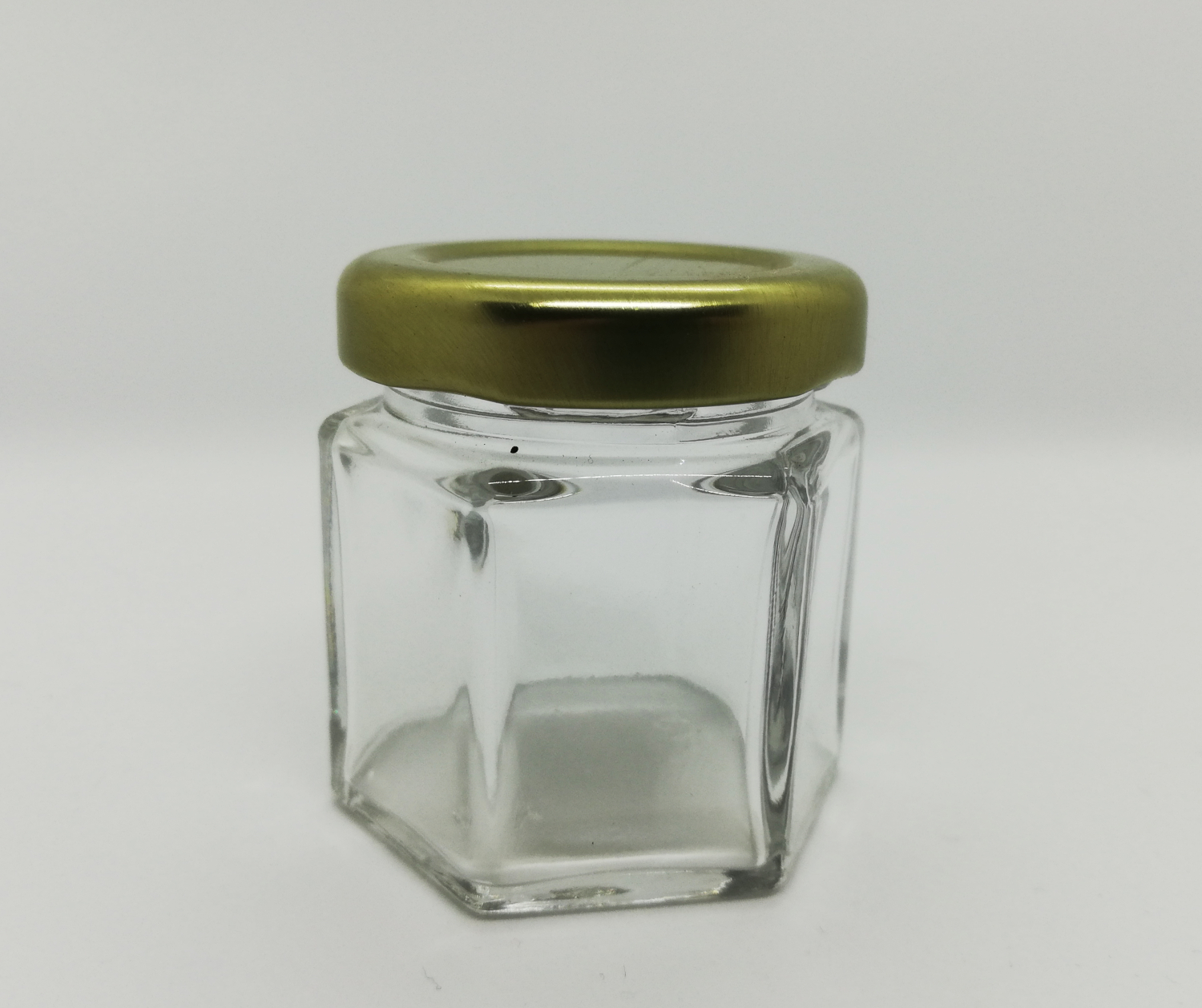 Frasco de vidro hexagonal com tampa dourada sobre fundo branco
