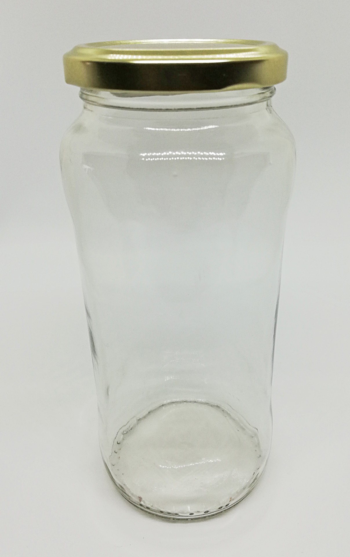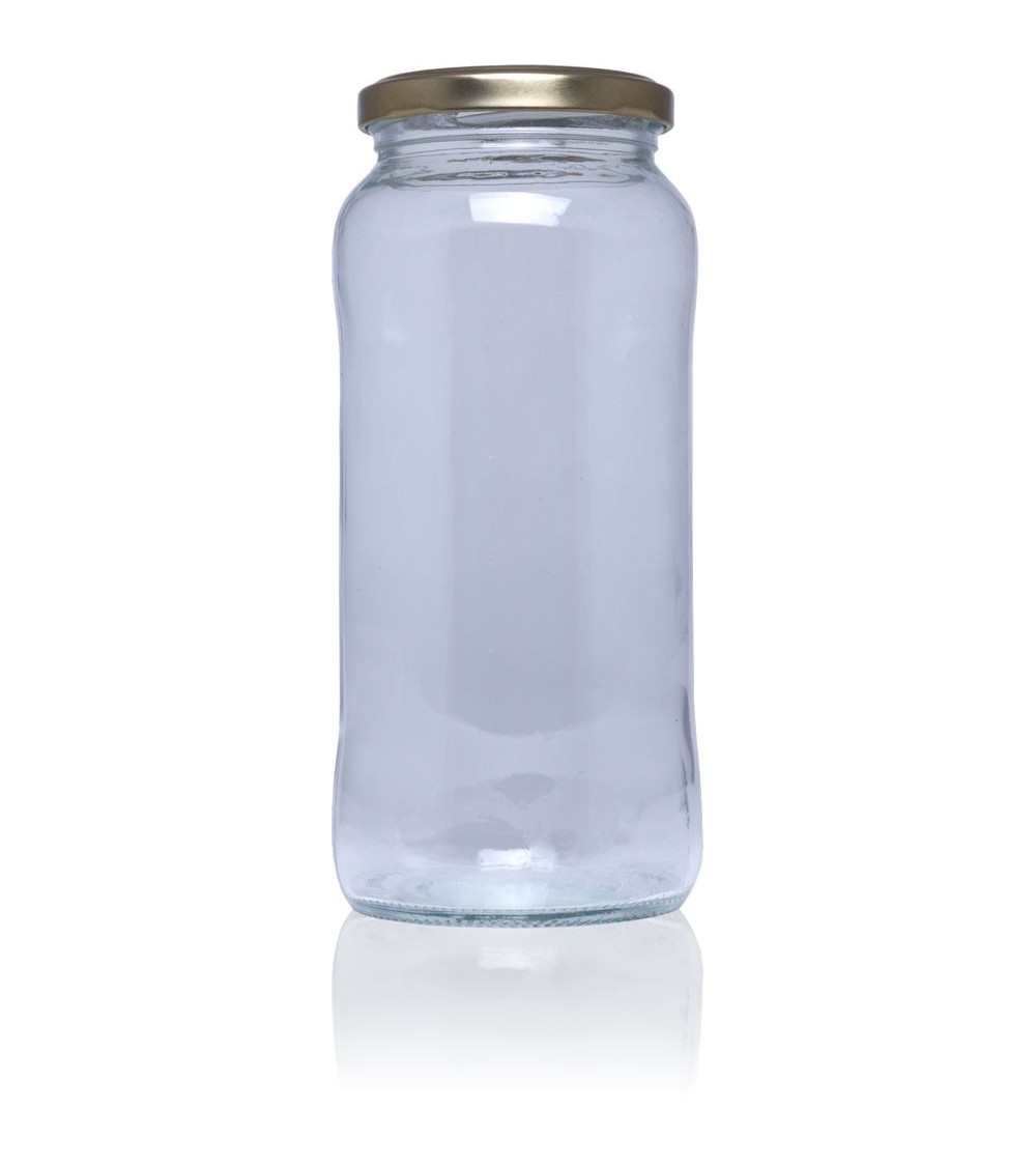 Frasco de vidro vazio com tampa dourada sobre fundo branco