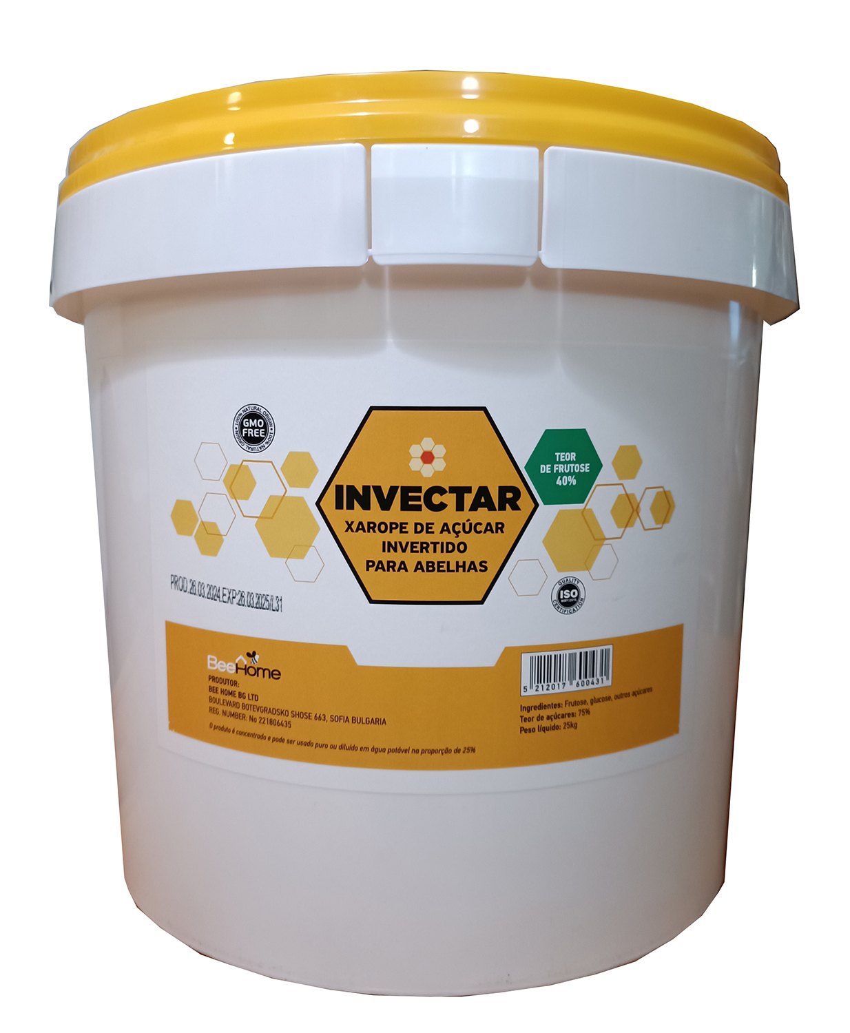 Balde de plástico branco com tampa amarela e rótulo de xarope para abelhas