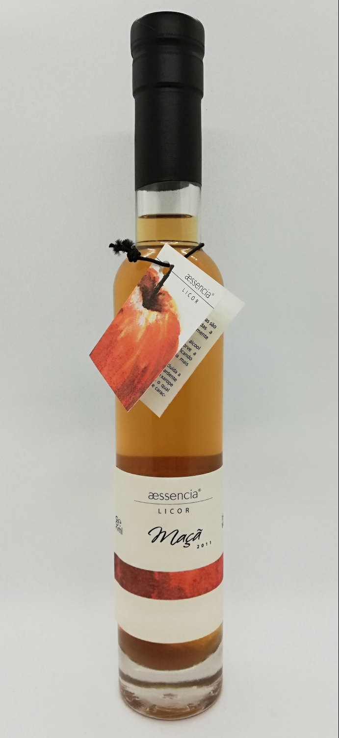 Garrafa de licor de maçã com rótulo branco e etiquetas penduradas