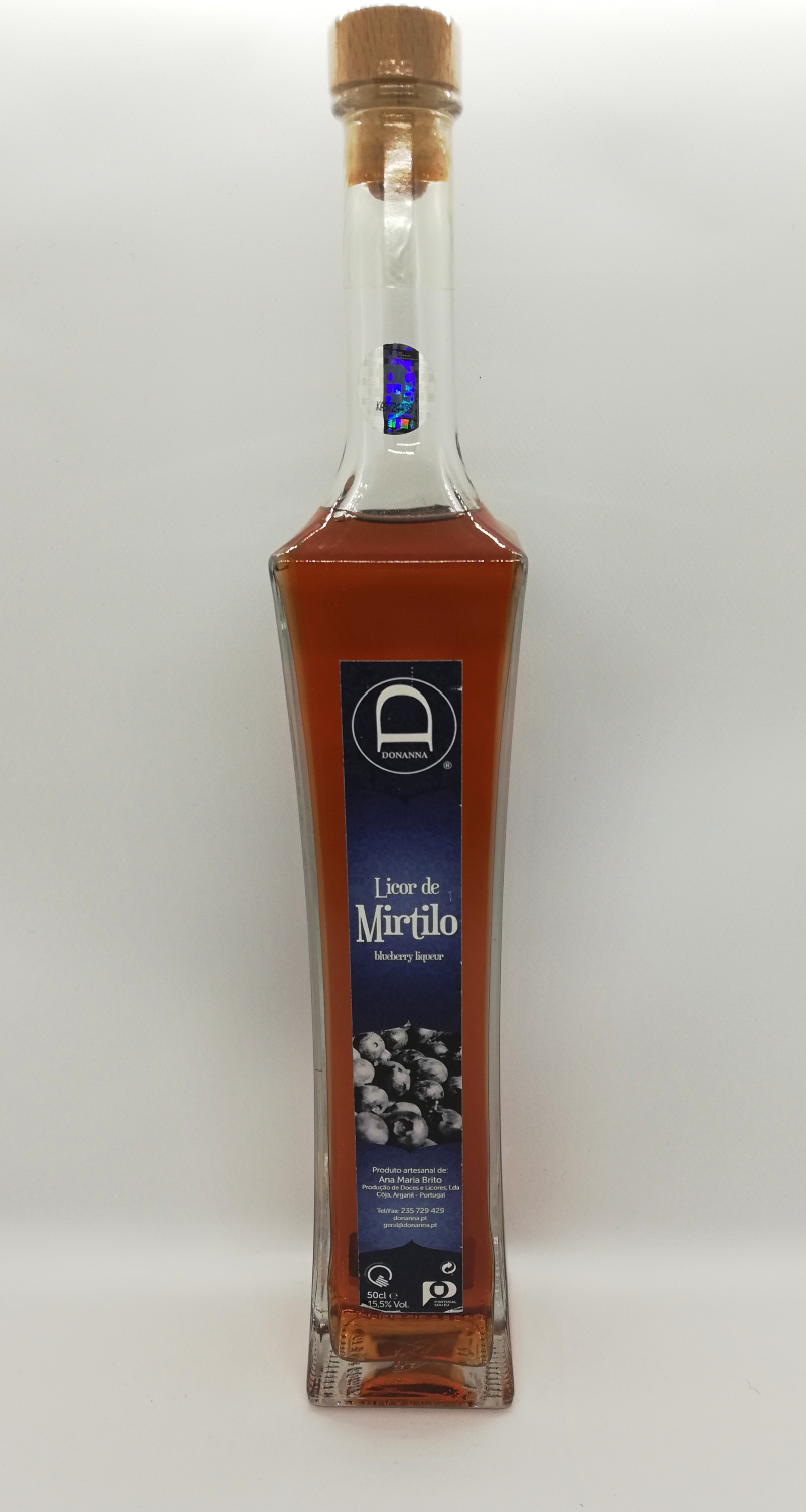 Garrafa de licor de mirtilo com rótulo azul e tampa de cortiça