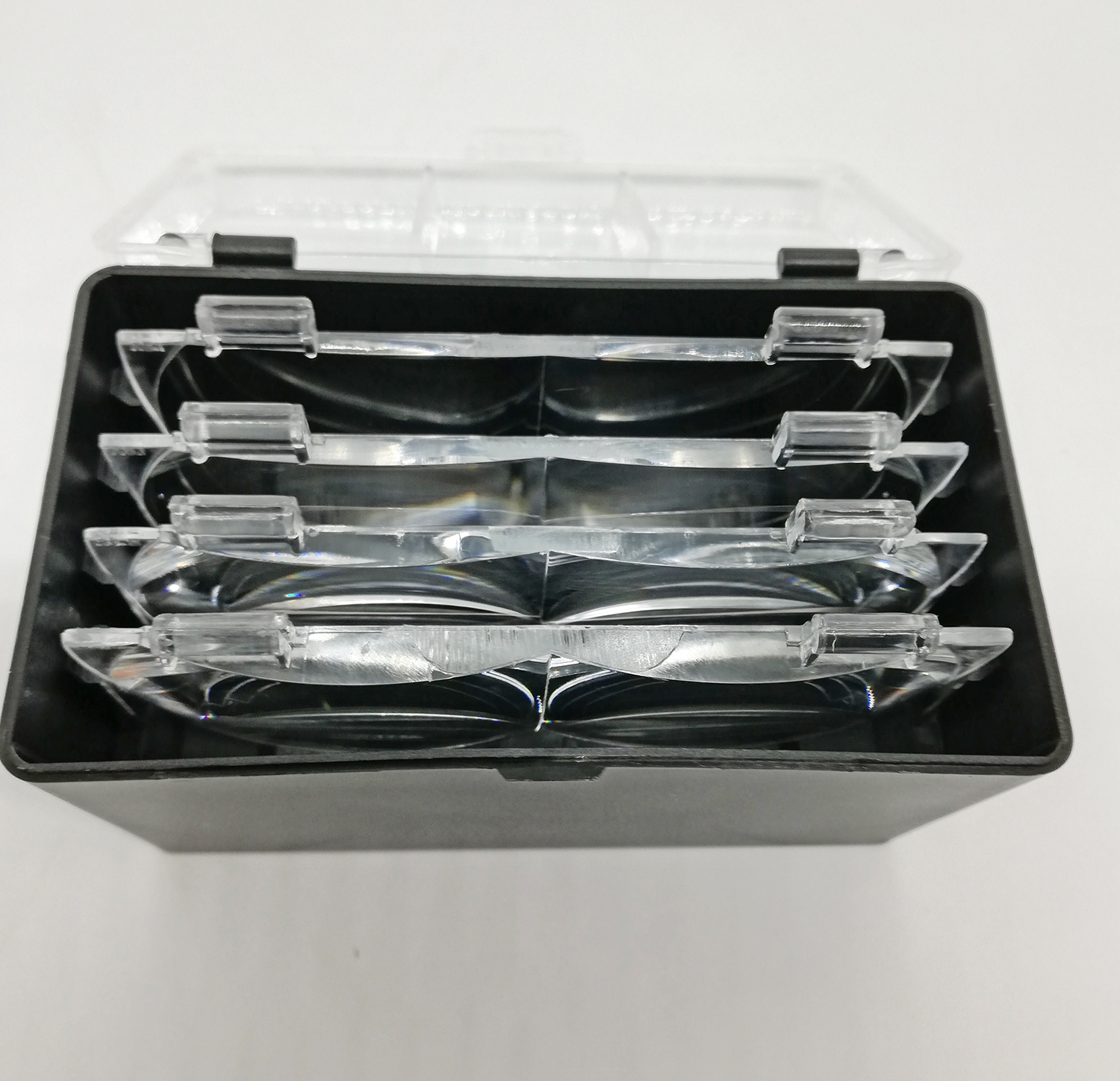 Caixa preta com tampas transparentes e divisórias horizontais