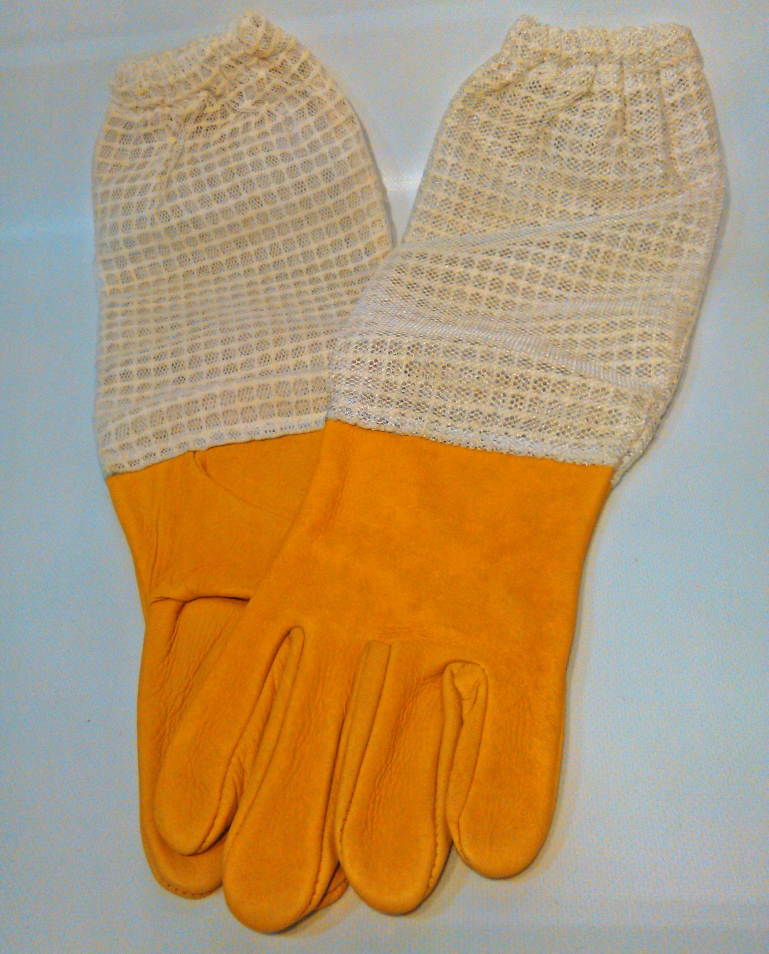 Par de luvas de proteção amarelas com parte superior branca de rede.