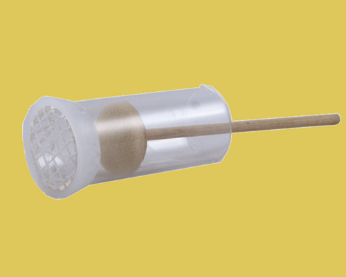 Filtro plástico transparente com parte de rede branca e haste de madeira
