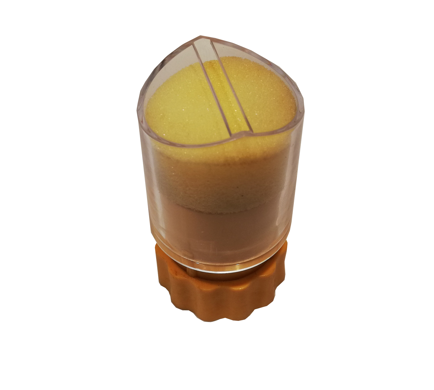 Esponja amarela redonda numa base plástica transparente com tampa dourada ondulada