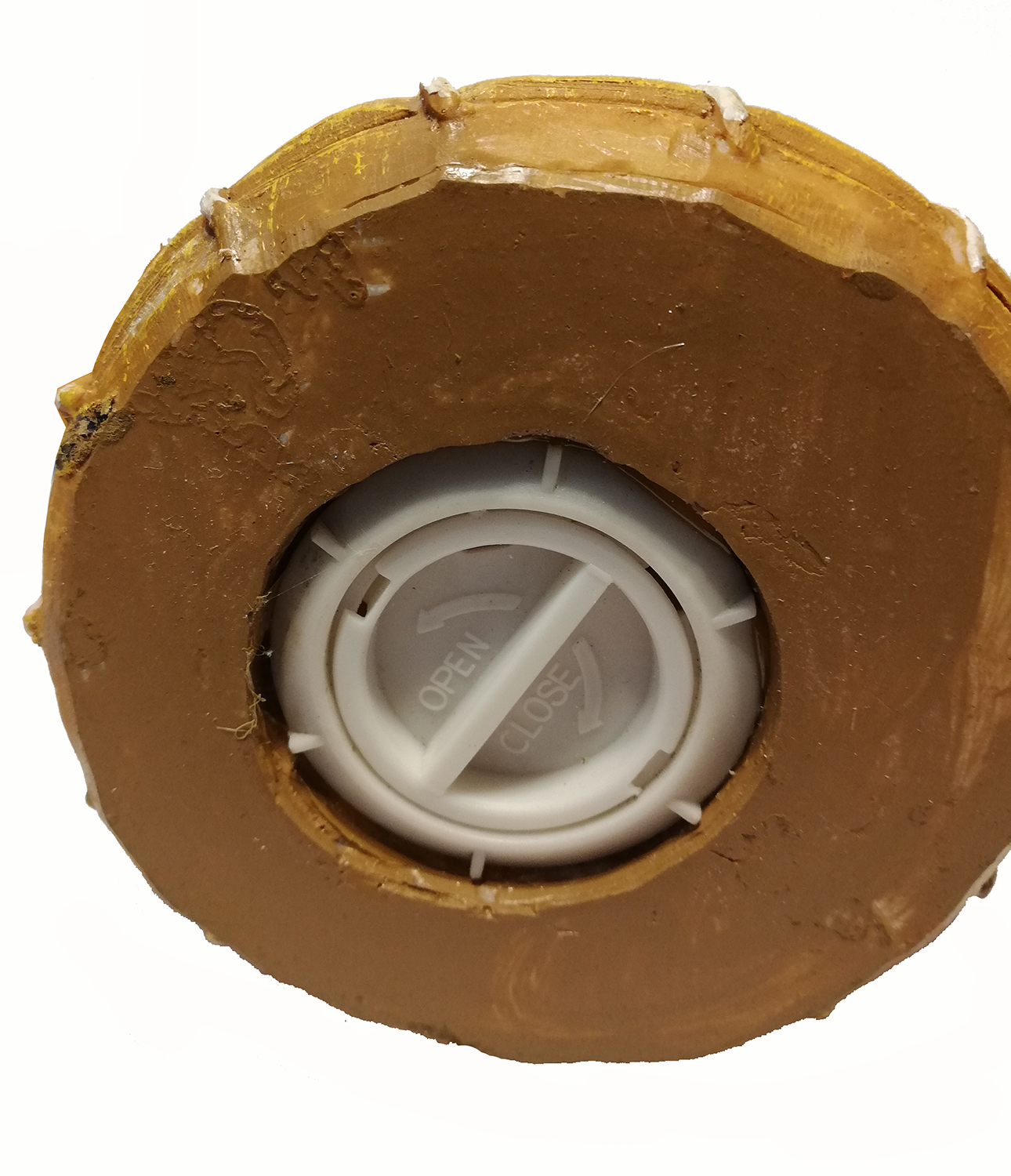 Fundo de objeto castanho com tampa branca rotativa com inscrições Open e Close