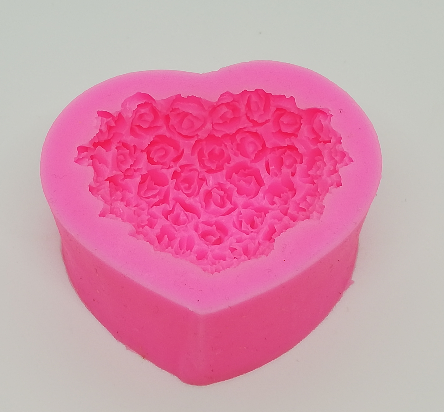 Forma de silicone rosa em formato de coração com flores detalhadas no interior
