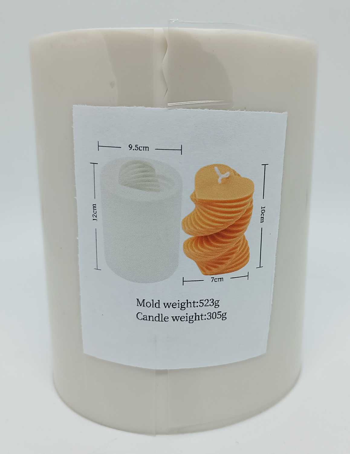Vela branca cilíndrica com etiqueta mostrando imagens e especificações do molde e vela