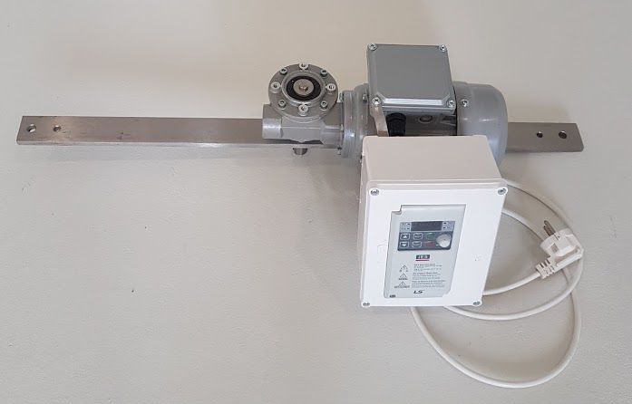 Motor elétrico cinzento com comando ABB em barra metálica sobre fundo branco