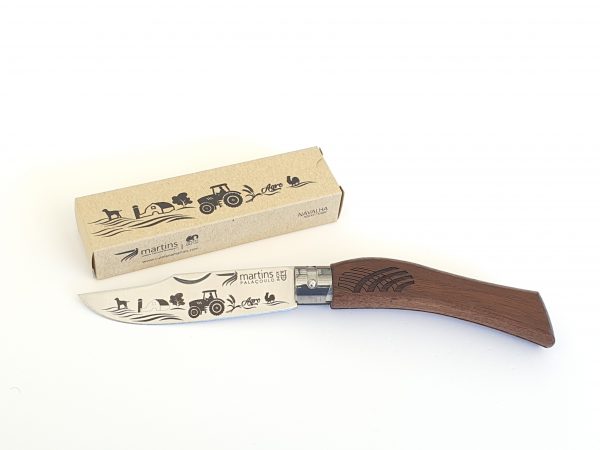 Com o punho em madeira de nogueira, a lâmina em Inox [AISI 420 mova] e o bloqueio giratório de lâmina, esta peça assume a evolução da navalha Transmontana plena de alma e a identidade.