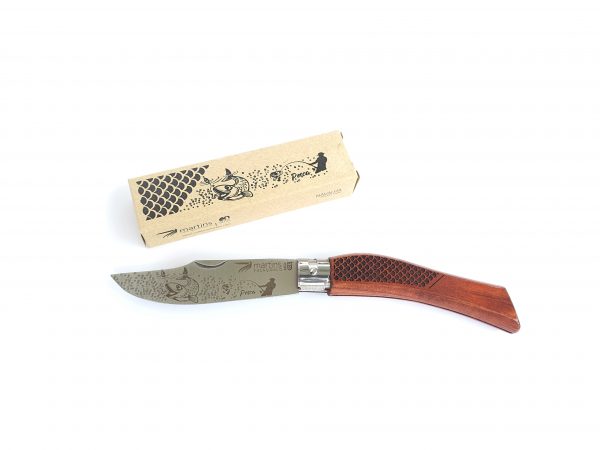 Navalha com grafismo de pesca no punho e na lâmina. Esta peça foi desenvolvida para um uso intensivo e está dotada de uma lâmina em aço inox [420 Mova] e um punho em madeira de Bubinga com sistema de bloqueio giratório de lâmina, [Giroblock] comprimento da lâmina: 95 mm