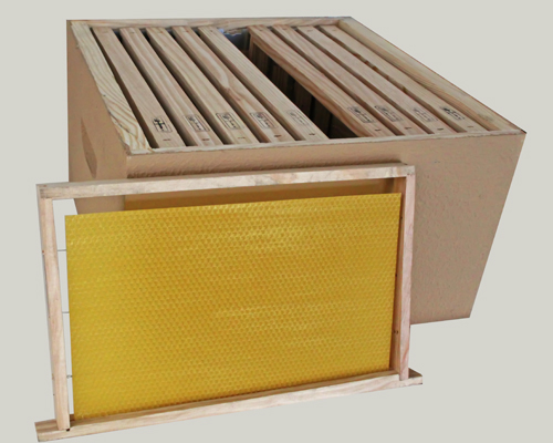 Quadros de mel em estrutura de madeira com cera amarela dentro de caixa de cartão