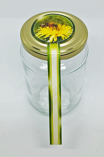 Frasco de vidro com tampa metálica e etiqueta com imagem de abelha