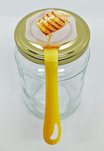 Frasco de vidro com tampa dourada e rótulo com colher de mel