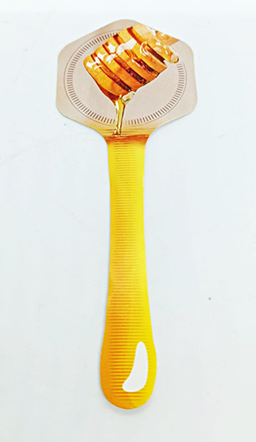 Colher de plástico amarelo com imagem de favo de mel no cabeçote