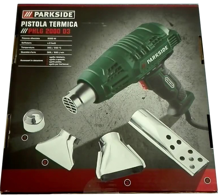 Pistola térmica PARKSIDE verde com três bicos metálicos sobre caixa preta com texto branco