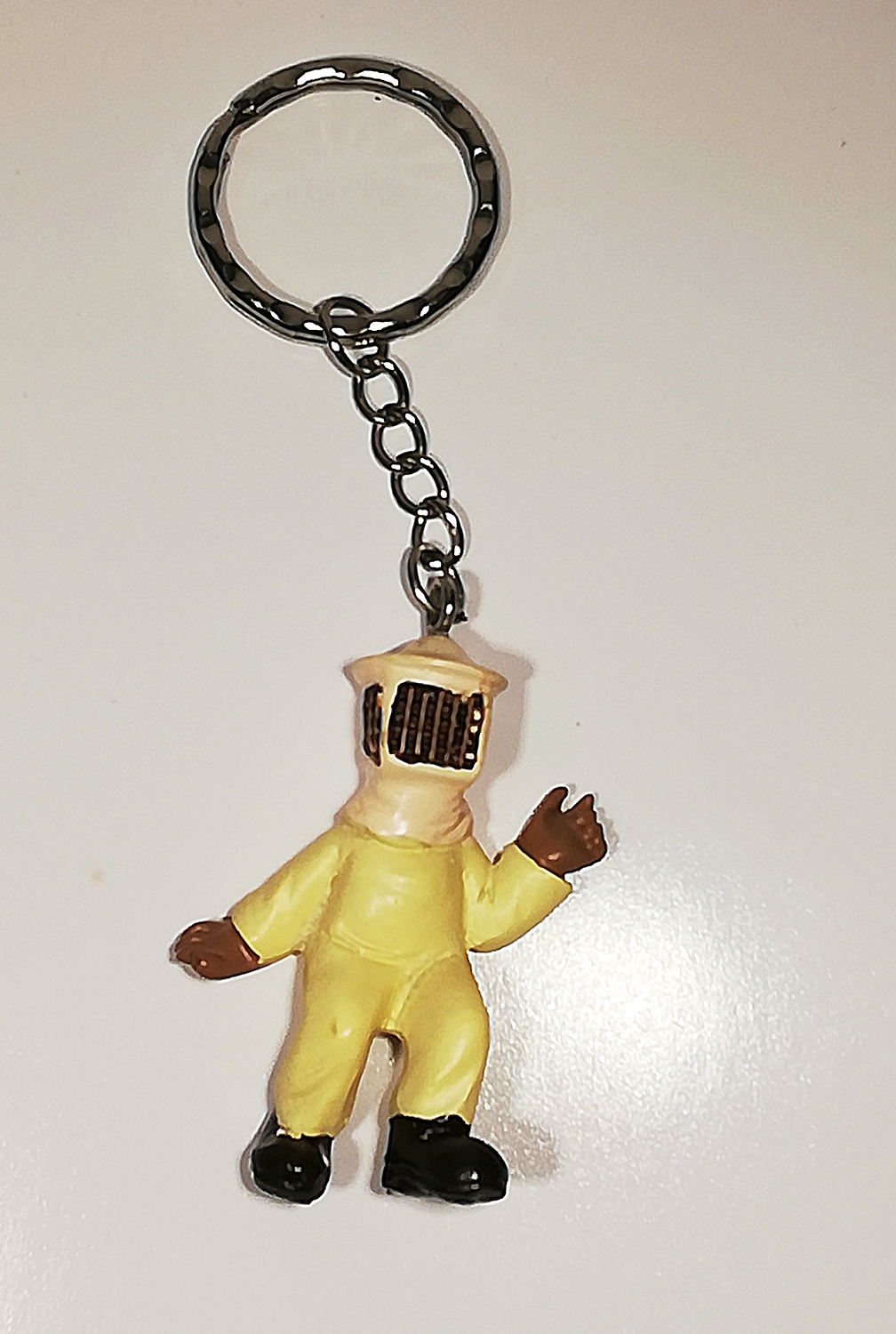 Porta-chaves com figura de personagem em fato amarelo e capacete bege