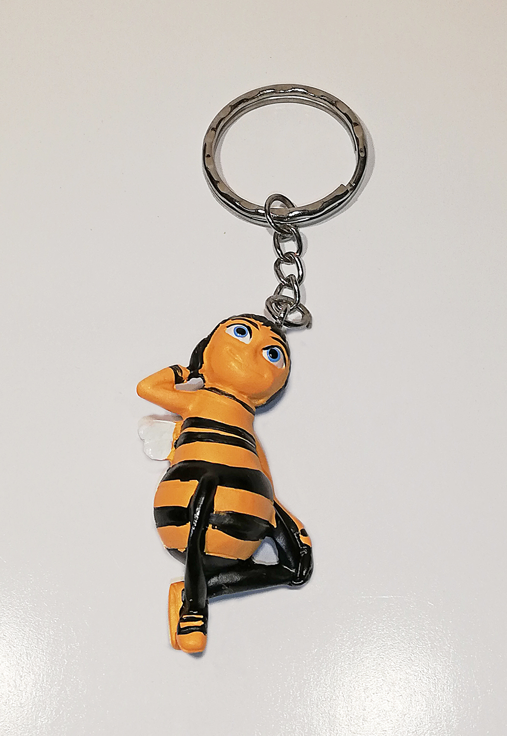 Chaveiro de abelha em plástico amarelo e preto com anilha metálica